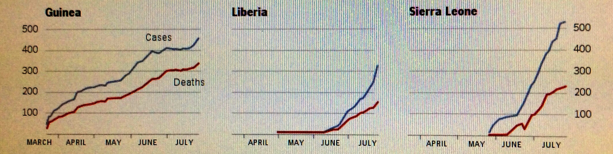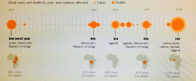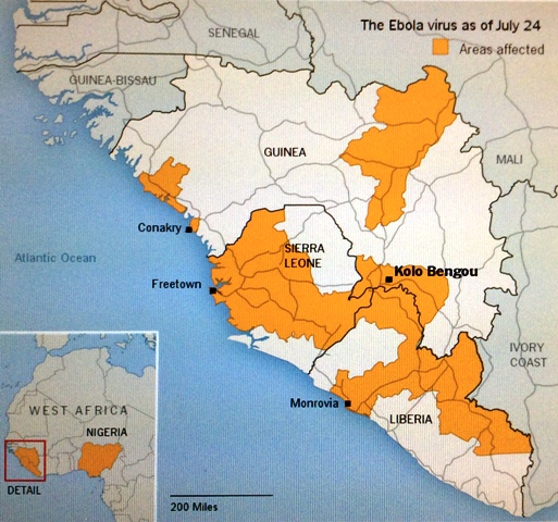 Da marzo ad oggi 4 agosto 2014,  secondo l’Organizzazione Mondiale della Sanità , più di 1300 persone in Guinea, Liberia e Sierra Leone hanno contratto Ebola. Questa è la più grave epidemia da quando, nel 1976, il virus è stato scoperto. Più della metà degli infetti sono morti. Un caso sospetto anche in Nigeria dove un uomo liberiamo da poco arrivato è morto il 25 luglio.