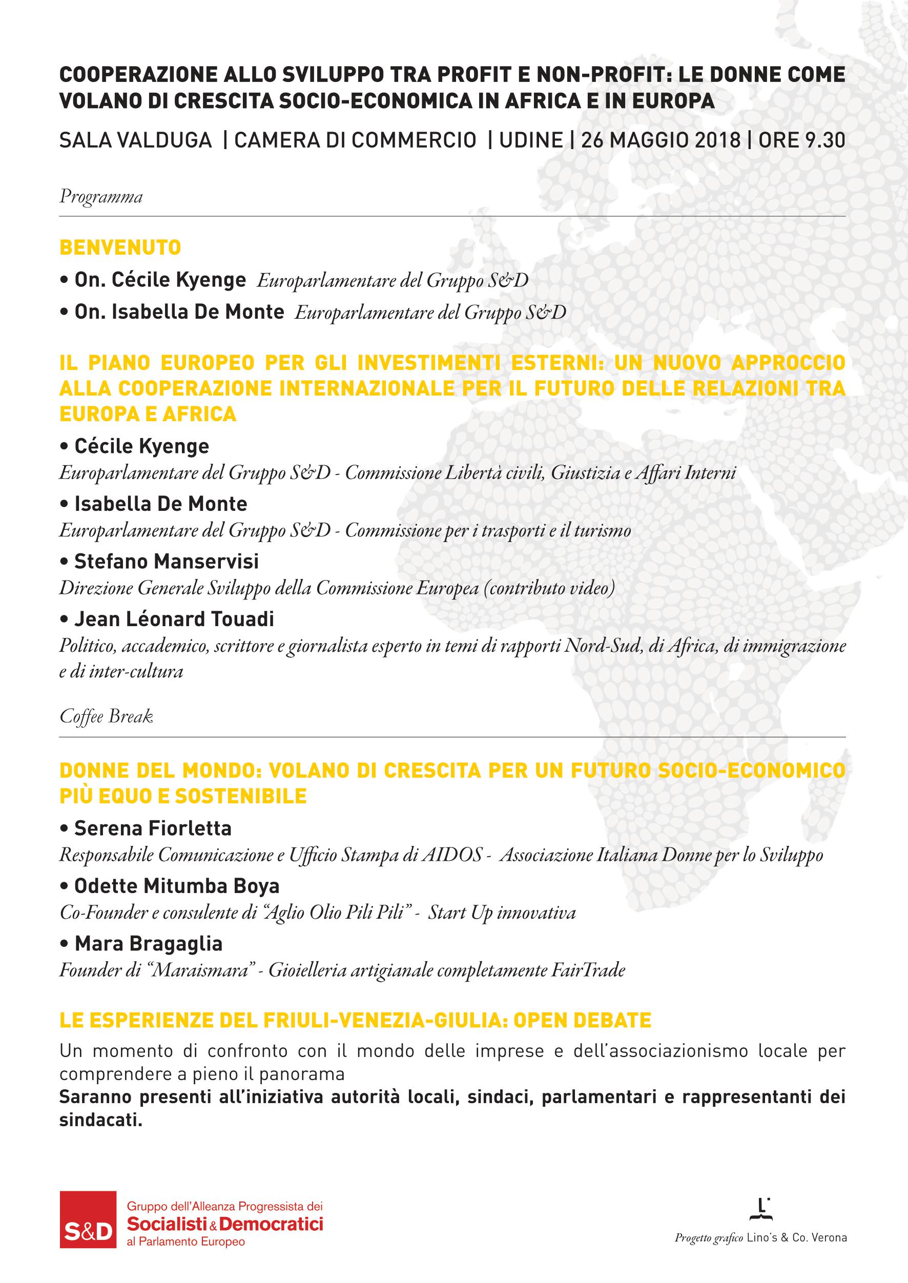 Sabato 26 maggio con inizio alle 9,30, c/o Sala Valduga della Camera di Commercio di Udine, in Piazza Venerio, 8 importante evento dedicato al rapporto Europa e Africa, promosso da Cecyle Kyenge e dal Gruppo dell’Alleanza progressista dei Socialisti e Democratici al Parlamento Europeo.