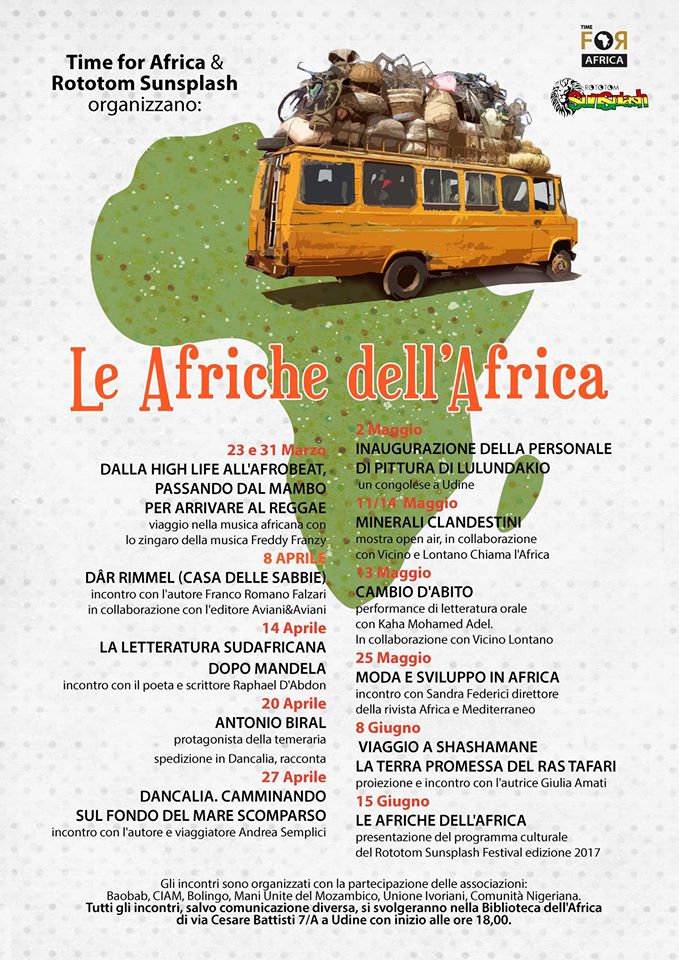 Il programma de “Le Afriche dell’Africa”, la rassegna dedicata al continente africano, organizzata da Time for Africa, in collaborazione con il Rototom Sunsplash e con il contributo di sei associazione africane di Udine, sta per concludersi. Da non perdere gli ultimi appuntamenti: la presentazione del film “Viaggio a Shashamane” e la conferenza stampa di presentazione della 24a edizione del Rototm Sunshplash.