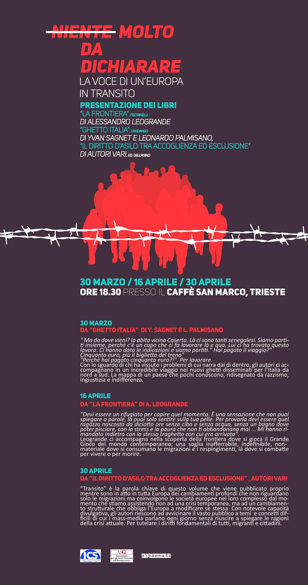 A Trieste dove l’accoglienza diffusa sembra funzionare,ICS, ASGI e S\Paesati organizzano tre incontri tra marzo e aprile per parlare e approfondire il tema delle migrazioni attraverso tre libri significativi che editi recentemente in Italia che affrontano il tema del grande cambiamento che sta avvenendo in Europa in connessione con le nuove migrazioni.