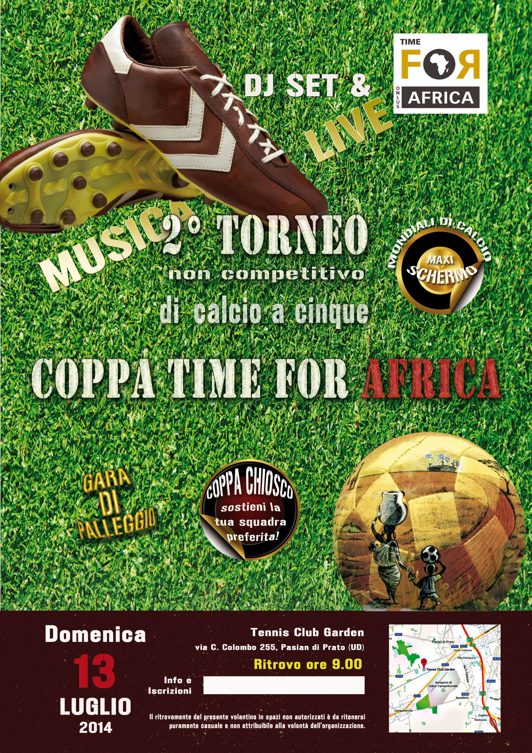 Domenica 13 luglio  ore 9,00, al via il secondo torneo di calcetto a cinque, Coppa Time For Africa, anche quest’anno si svolgerà nelle installazioni sportive del Tennis Garden Club di Pasian di Prato (ud) che dispone di ben 3 campetti da calcio di cui  due coperti
