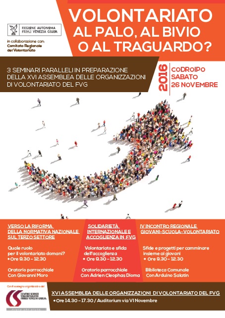 Sabato 26 novembre a Codroipo la XVI assemblea delle organizzazioni di volontariato della nostra Regione. Un importante e cruciale appuntamento che, noi pensiamo, possa ridisegnare confini, contenuti, e ruoli del Volontariato del prossimo futuro. Un Volontariato che non sia solo sussidiarietà per un paese, incapace di reagire in modo innovativo alle sfide del cambiamento, ma protagonista nel portare avanti la logica generativa del nuovo welfare. Una Assemblea che sappia ridare centralità a questo movimento, creare reti di relazioni tra le varie aree e che contribuisca a fare della riforma del terzo settore uno strumento efficace e utile al Paese.